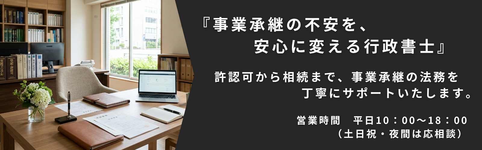 事業承継には、許認可の継承・定款の見直し・事業の継続・遺言書など、多岐にわたる「法的な整え」が必要です。