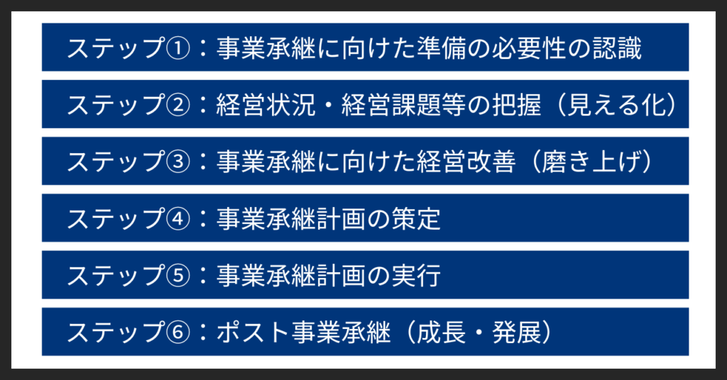 事業承継は、次のような流れで進めるとスムーズです。ここでは親族内承継、従業員・役員承継のケースで検討します。中小企業庁「事業承継ガイドライン(第3版)」を参考にしています。